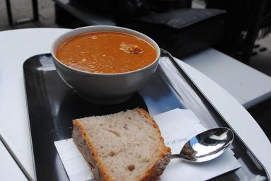 Keywords: soup food pumpkin orange plate restaurant tasty café bread spoon