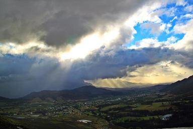 Keywords: south africa vineyards landscape winegrowing view panorama sky clouds weather mood colourful clouds weather lighting atmosphere sunbeam nature lichtspiel mountains atmospheric sunlight clouds gaps drama incidence of light wine country
