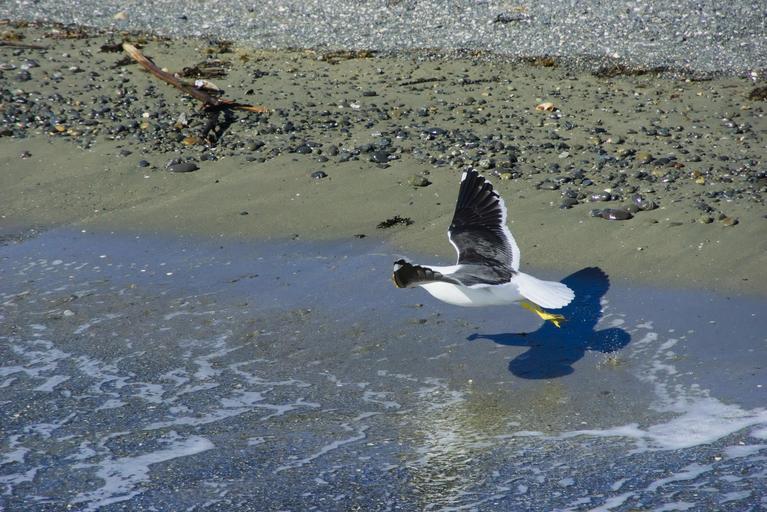 Keywords: The gull is flying this mussel up in the air and dropping it, hoping to open it up Eastborne Shore - Wellington