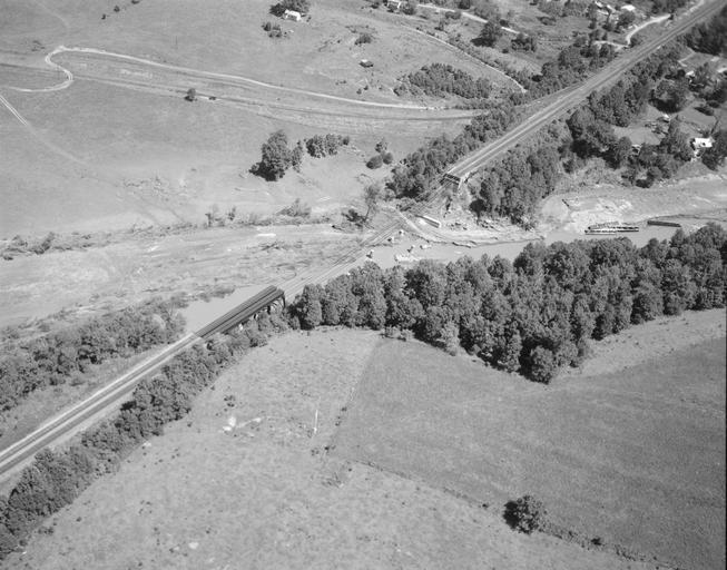 Keywords: richmond va usa hurricane camille hurricanecamille flood flooding damage natural disaster naturaldisaster virginia richmond va usa virginiarichmondvausa blackandwhite monochrome outdoor black and white An aerial view of the Southern Railroad crossing at the Tye River. The bridge was washed away leaving only the tracks behind. The collapsed piers can be seen below. Located 1/4 mile west of Rt. 739 in Nelson County. No. 69-2148, Virginia Governor's Negative Collection, Library of Virginia. An aerial view of the Southern Railroad crossing at the Tye River. The bridge was washed away leaving only the tracks behind. The collapsed piers can be seen below. Located 1/4 mile west of Rt. 739 in Nelson County. No. 69-2148, Virginia Governor's Negative Collection, Library of Virginia. |