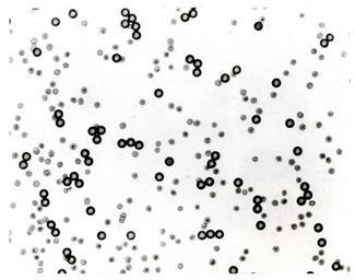 Keywords: SpaceBeadsSRM 030.jpg A small area of a microscope slide shows human red blood cells along with the 10-micrometer spheres dark circles that were made in space NBS standard reference material SRM 1960 10-Micrometer Polystyrene Spheres is an inmportant tool for calibrating instruments to measure small particles such as blood cells National Institute of Standards and Technology National Institute of Standards and Technology PD-USGov-NIST PD-USGov National Bureau of Standards National Institute of Standards and Technology Space Beads