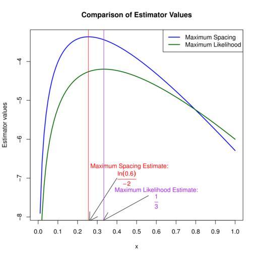 Keywords: Spacing Estimation plot for MSE example.svg Created with R Created with Inkscape yes ValidSVG en Vector version of File Spacing Estimation plot for MSE example png saved as a PDF brought into w Inkscape and converted to SVG Own Avraham 2009-07-27 <gallery>File Spacing Estimation plot for MSE example png</gallery> Code This is the code used to generate the plot It could have been done more efficiently but this way is more self-explanatory <pre> SpacingEstimate<-function x A1<-1-exp -2 x A2<-1-exp -4 x Z<- A1 A2-A1 1-A2 return log Z Likelihood<-function x A1<-x exp -2 x A2<-x exp -4 x Z<-A1 A2 return log Z x<-seq 0 1 01 plot x SpacingEstimate x main Comparison of Estimator Values type l col blue xaxp c 0 1 10 lwd 2 ylab Estimator values points x Likelihood x col dark green type l lwd 2 arrows 4 -7 26 -8 1 arrows 56 -7 45 33 -8 09 text x 463 y -6 7 labels Maximum Spacing Estimate col red text x 45 y -7 0 labels expression frac ln 6 -2 col red text x 6 y -7 3 labels Maximum Likelihood Estimate col purple text x 6 y -7 6 labels expression frac 1 3 col purple abline v log 6 /-2 col red abline v 1/3 col purple legend topright legend c Maximum Spacing Maximum Likelihood col c blue dark green lwd 2 </pre> cc-zero SVG mathematics Statistical charts |