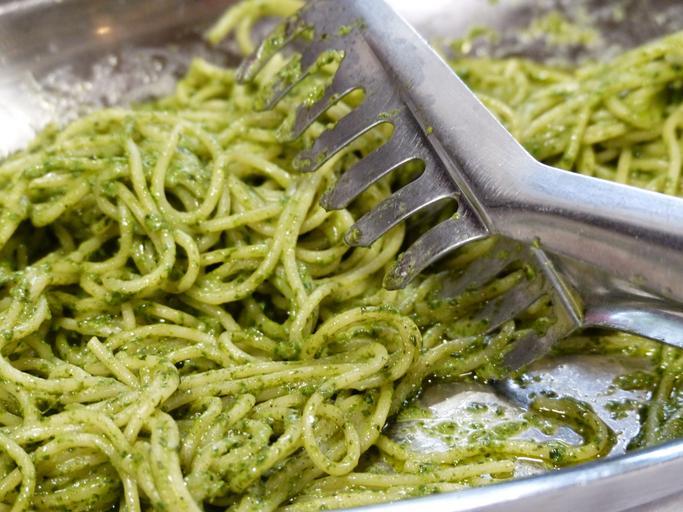 Keywords: spaghetti noodles eat parmesan cheese parmesan cheese pesto handmade homemade frisch delicious basil dinner lunch starter italy national dish pasta tongs bowl portion