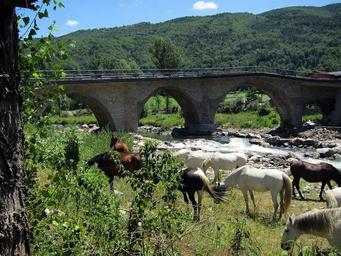 Keywords: spain landscape bridge horses animals architecture mountains sky clouds scenic grass plants stream river water rocks valley forest trees woods nature outside country countryside rural summer spring