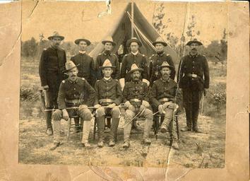 | Keywords: first north carolina regiment firstnorthcarolinaregiment spanish-american war spanishamericanwar monochrome Group photograph of officers in uniform with a U.S. Volunteers unit [believed to be the First North Carolina Regiment], posing outside of a tent in the unit’s military camp in an unidentified location [believed to be in Cuba]. Major George E. Butler is pictured seated, at far left (undated) [photograph owned by George E. Butler]. Group photograph of officers in uniform with a U.S. Volunteers unit [believed to be the First North Carolina Regiment], posing outside of a tent in the unit’s military camp in an unidentified location [believed to be in Cuba]. Major George E. Butler is pictured seated, at far left (undated) [photograph owned by George E. Butler]. |
