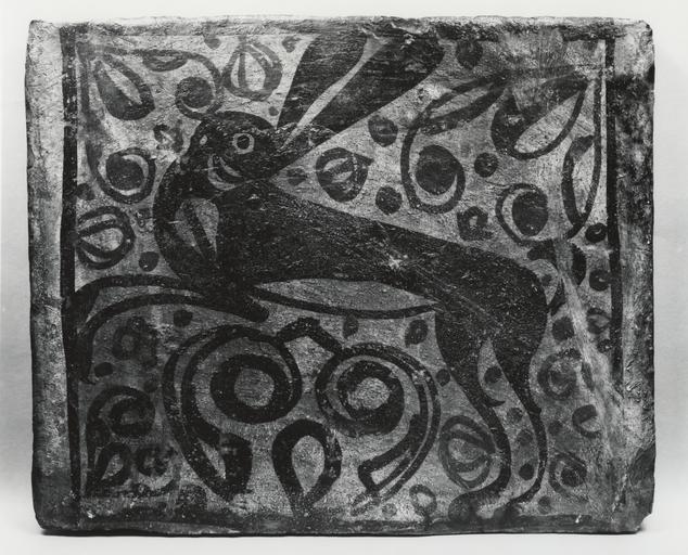Keywords: Spanish - Ceiling Tile with a Hare - Walters 48210612.jpg As duke of Segorbe after 1478 Spanish Crown Prince Enrique de Aragon y Sicilia 1445-1522 was also lord of the nearby towns of Paterna and Manises centers of flourishing ceramic manufacture from the taxation of which he derived handsome profit The residence of the duke's representative in Paterna was appropriately known as the Tax House Casa del Delme Some two hundred ceiling tiles this one possibly among them decorated the building until they were sold and dispersed in 1924 The rabbit on it refers to hunting a pastime reserved for aristocrats ca 1513 Early Modern earthenware with glaze and paint cm 35 4 43 8 3 accession number 48 2106 12 27977 Casa del Delme 13 calle Mayor Paterna Sale 1924 William R Hearst San Simeon California ca 1930 by purchase Hearst estate 1951 by bequest inv 2597 lot s/b 569 no 49 Walters Art Museum 1958 by purchase Museum purchase 1958 Realms of Faith Medieval and Byzantine Art from the Walters Art Museum Museum of Biblical Art New York; Colby College Museum of Art Waterville; Joslyn Art Museum Omaha 2008-2009 place of origin Paterna Spain Walters Art Museum license Renaissance applied arts in the Walters Art Museum Ceramics in the Land of Valencia Socarrat Tiles Spanish maiolica |