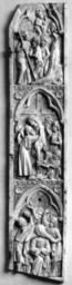 | Keywords: Spanish - Wing of a Folding Tabernacle with Scenes of the Passion - Walters 71175.jpg This plaque along with Walters 71 176 are the only surviving ivories from a folding tabernacle that contained a Crucifixion They are of unusually tall form and combine features of the Rose Group in the bands of roses that divide the scenes horizontally with trefoil arches flanked by rosettes The placement of this wing in the shrine was far right This wing is carved from bottom to top with the Buffeting of Christ Deposition from the Cross and Harrowing of Hell Diagonal iron hinges are inset on the left edge Among the iconographical rarieties are the Harrowing of Hell with large devils in the air and the Buffeting of Christ The other scenes are typical of Rose Group ivories A Parisian work may have served as the model The carving here is very uneven in quality The enframements are unusual and the form of a tabernacle for a central Crucifixion group is unique These features combined with the use of iron hinges suggest a non-French center The frequent use in Spain of tabernacle enclosures for sculpture would seem to confirm a Spanish attribution Both plaques have suffered from exposure They have been cut horizontally at the top and the remaining hinges have rusted and broken the ivory The right wing has been cut diagonally at the bottom There are iron nails centrally placed in the trefoil arches of three scenes Each plaque is inscribed on the back 8809/R-73101/las dos tiras between 1300 1330 Medieval ivory cm 29 8 6 2 accession number 71 175 38631 Spain Léon Gruel Paris date of acquisition unknown by purchase in Spain Henry Walters city Baltimore Walters Art Museum Henry Walters Acquired by Henry Walters 1923 Transcription On back 8809/R-73101/las dos tiras place of origin Spain Walters Art Museum license Medieval ivory in the Walters Art Museum Art of Spain Media contributed by the Walters Art Museum needs category review |