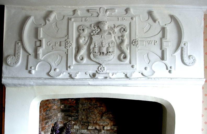 | Keywords: SpanishCompanyArms Overmantel 1630 RookabeareHouse Fremington Devon .PNG en Strapwork plaster overmantel in Rookabeare House in the parish of Fremington Devon showing the arms of the Spanish Company Azure in base a sea with a dolphin's head appearing in the water all proper on the sea a ship of three masts in full sail all or the sail and rigging argent on each a cross gules in the dexter chief point the sun in splendour in the sinister chief point an estoile of the third; on a chief of the fourth a cross of the fifth charged with the lion of England The crest here missing was Two arms embowed issuing out of clouds all proper holding in the hands a globe or clearly visible as an armillary sphere on the monument to Richard Beaple in St Peter's Church Barnstaple The supporters were Two seahorses argent finned or of which the nearest forelegs of each are missing Rookabeare was the residence of the Paige family prominent merchants at nearby Barnstaple On the left side of the arms appear the initials G S P possibly for Gilbert Paige and his wife Sara Cade Gilbert Paige c 1595-1647 was a merchant who was twice Mayor of Barnstaple in 1629 and 1641 His son's mural monument survives in St Peter's Church Barnstaple On the other side are the initials WP possibly for William Page See Reed Margaret A A Brief History of Higher Rookabear Collection of North Devon Athaneum Barnstaple The date above is 1630 the significance of which is unclear Perhaps it was the date of his admission to the lucrative membership of the Spanish Company It is unusual that personal arms are not used in such a domestic setting Perhaps as yet he had received no grant of arms or perhaps he wanted to record his membership of the Company above all else and keep it in continual view From Rookabeare House high on a hill on the south/west bank of the River Taw an exceptional view is had of the shipping lane of the River Taw into the former port of Barnstaple From here the Paiges could thus monitor the cargoes coming into port own photo Lobsterthermidor <span class signature-talk ></span> 22 14 7 January 2016 UTC 2015 Spanish Company arms Overmantels Strapwork Rookabeare Fremington |