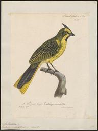 | Keywords: Special Collections University of Amsterdam - Iconographia Zoologica - UBA01 IZ1207714 001 - Gubernatrix cristata Vieillot, 1817 - P. Oudart - G. Engelmann - Print - 1825-1834.tif Basis of record Artwork Scientific name Gubernatrix cristata Vieillot 1817 Catalog number UBA01_IZ1207714_001 Collection code ubainv274 Vertebrata Aves Passeres Linnaeus - Conirostres Cuvier Emberizidae A Newton - Emberizinae Bonaparte Gubernatrix Lesson Specific epithet cristata Infraspecific rank Infraspecific epithet Scientific name authorship Vieillot 1817 Nomenclatural code Kind of unit specimen Type status Life stage Individual count State or province Collection date Vieillot La galerie des oiseaux pl 67 nl De vogels zijn geordend volgens https //archive org/stream/handlistofgenera02britrich page/114/mode/2up G R Gray Hand-list of genera and species of birds 1869-1871 soortnummer 7714 en The birds have been arranged according to https //archive org/stream/handlistofgenera02britrich page/114/mode/2up G R Gray Hand-list of genera and species of birds 1869-1871 species number 7714 Number new box 63 Old name Gubernatrix cristatella Veillot Occurrence ID Institution Special Collections of the University of Amsterdam UvA-BC Source url http //dpc uba uva nl/inventarissen/ubainv274 Upcoming link as of July 2016 Title publication Author publication Subject keywords publication Publication location Document type Title artwork Creator Paul Louis Oudart artwork Groene kardinaal Yellow cardinal Medium artwork Print Dimensions artwork Size cm 33 25 Kind of unit artwork Subject keywords artwork Other versions artwork Permission license PD-old-100-1923 Iconographia Zoologica Images from the Special Collections of the University of Amsterdam Godefroy Engelmann Paul Louis Oudart Gubernatrix cristata |