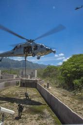 | Keywords: Special Operations Air Insertion, RIMPAC 2014 140710-N-PX130-070.jpg en A U S Marine Special Operations Team and Republic of Korea SEALs fast rope from an MH-60S Sea Hawk helicopter assigned to Helicopter Combat Squadron HSC 14 during an air assault exercise as part of Rim of the Pacific RIMPAC Exercise 2014 The world's largest international maritime exercise RIMPAC provides a unique training opportunity that helps participants foster and sustain the cooperative relationships that are critical to ensuring the safety of sea lanes and security on the world's oceans Twenty-two nations more than 40 ships six submarines more than 200 aircraft and 25 000 personnel are participating in RIMPAC U S Navy photo by Mass Communication Specialist 1st Class Daniel Gay/Released 2014-07-10 Petty Officer 1st Class Daniel Gay https //www dvidshub net/image/1446064 140710-N-PX130-070 2014-07-13 18 46 BELLOWS AIR FORCE STATION HI US PD-USGov-Military-Navy MH-60S Seahawk RIMPAC 2014 Images from DoD uploaded by Fæ |