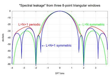 | Keywords: Spectral leakage from three 8-point triangular windows.png en Comparing the discrete-time Fourier transforms of symmetric and periodic windows The triangular form was chosen for its non-zero end-points one of which is discarded in the periodic version with a noticeable performance degradation Parameter L is the width of the base of the triangle in units of the sample interval Parameter N is 8 2016-04-11 own Bob K other versions Octave script <source lang Matlab > pkg load signal graphics_toolkit gnuplot clc M 7200; window triang M '; row vector N 8; window size in samples dx M/ N+1 ; decimation factor for 9 hops 10 samples symmetric9 window 1+ 1 8 dx ; sample symmetrically periodic9 window 1+ 5 7 5 dx ; sample asymmetrically dx M/N; decimation factor for 8 hops 9 samples symmetric8 window 1+ 5 7 5 dx ; sample symmetrically Compare equivalent noise bandwidths info only ENBW_symmetric9 N sum symmetric9 2 /sum symmetric9 2 ENBW_symmetric8 N sum symmetric8 2 /sum symmetric8 2 ENBW_periodic9 N sum periodic9 2 /sum periodic9 2 Plot the points figure plot 0 7 symmetric9 'color' 'blue' ' ' hold on plot 0 7 symmetric8 'color' 'green' ' ' plot 0 7 periodic9 'color' 'red' ' ' Now compute and plot the DTFTs M 64 N; dr 80; H abs fft symmetric8 zeros 1 M-N ; H fftshift H ; H H/max H ; H 20 log10 H ; H max -dr H ; x N -M/2 M/2-1/M; figure plot x H 'color' 'green' 'linewidth' 2 hold on ylim -dr 0 H abs fft periodic9 zeros 1 M-N ; H fftshift H ; H H/max H ; H 20 log10 H ; H max -dr H ; plot x H 'color' 'red' 'linewidth' 2 ; H abs fft symmetric9 zeros 1 M-N ; H fftshift H ; H H/max H ; H 20 log10 H ; H max -dr H ; plot x H 'color' 'blue' 'linewidth' 2 ; set gca 'XTick' -N/2 N/2-1 grid on ylabel 'decibels' xlabel 'DFT bins' text -1 51 -52 '\leftarrow L N+1 symmetric' 'color' 'blue' 'FontSize' 14 text 1 56 -20 3 '\leftarrow L N symmetric' 'color' 'green' 'FontSize' 14 text -3 46 -20 3 'L N+1 periodic' 'color' 'red' 'FontSize' 14 title ' Spectral leakage from three 8-point triangular windows' 'FontSize' 14 </source> cc-zero Digital signal processing |