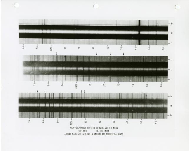 Keywords: SpectroscopyResearch 021.jpg Because the distance of Mars was decreasing at the time there is a Doppler shift in the Martian spectrum towards the shorter wavelengths However this only affects lines originating on Mars or present in the original sunlight that Mars reflects The Doppler shift is clearly eviden at places marked by arrows In the case of the strong absorption line at 7187 38 A which is a blend of a solar iron line and a terrestrial water-vapor line the shift is sufficient for the iron line to form a new blend with the H2 line at 7187 01 A and thereby alter the relative strengths of the lines compare adjacent spectrum of the moon If oxygen or water-vapor lines were present in these Martian spectra they ought to appear as faint companions to the corresponding lines produced by the earth's atmosphere but no such companion lines are to be seen National Institute of Standards and Technology 1956-07-21 National Institute of Standards and Technology PD-USGov-NIST PD-USGov National Bureau of Standards National Institute of Standards and Technology Spectroscopy |