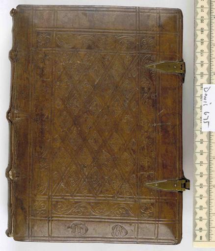 | Keywords: Speculum patientiae -bound with Alveld, Augustin, Super apostolica sede, ad videlicet divino sit iure necne- - Upper cover (Davis675).jpg Style Diaper Panel design Single tools design Lion Bird motif Evangelist symbol; Caption Upper cover; Colour Brown; Edge Plain exhibition history Decorative Technique Tooled in blind; Cover Material Calf Wooden boards 2 pairs of brass clasps on leather thongs Vellum ms endleaves Designs differ on upper and lower covers Lower cover features toolsing including Evangelists symbols Sacred Monograms and shelied shaped tools with two hands two feet a heart pierced by spear and three nails Provenance note Carthusian monastery 'Castrum S Mariae' at Wedderen near Duelmen Not all bindings from that monastery were bound there Some of the same tools appear on C64a10 EBDBW002359 object history Text 1520; Leipzig; Unspecified object type Cc-zero place of creation Binding Germany place of discovery See M M Foot The Henry Davis Gift vol II London 1983 pp 34-36 M Rozsondai B Rozsondai Symmetry aspects of bookbindings in Computers and mathematics with applications vol 17 numner 4-6 1989 Symmatry 2 p850 British Library image http //www bl uk/catalogues/bookbindings/LargeImage aspx RecordId 020-000004654 ImageId ImageId 41932 Copyright BL Speculum patientiae bound with Alveld Augustin Super apostolica sede ad videlicet divino sit iure necne Uploaded with GWToolset Speculum patientiae bound with Alveld Augustin Super apostolica sede ad videlicet divino sit iure necne - Upper cover Davis675 http //www webarchive org uk/bldatasets/bindings/6507_4 jpg Bookbinding 16th-century bookbinding British Library Bookbindings |