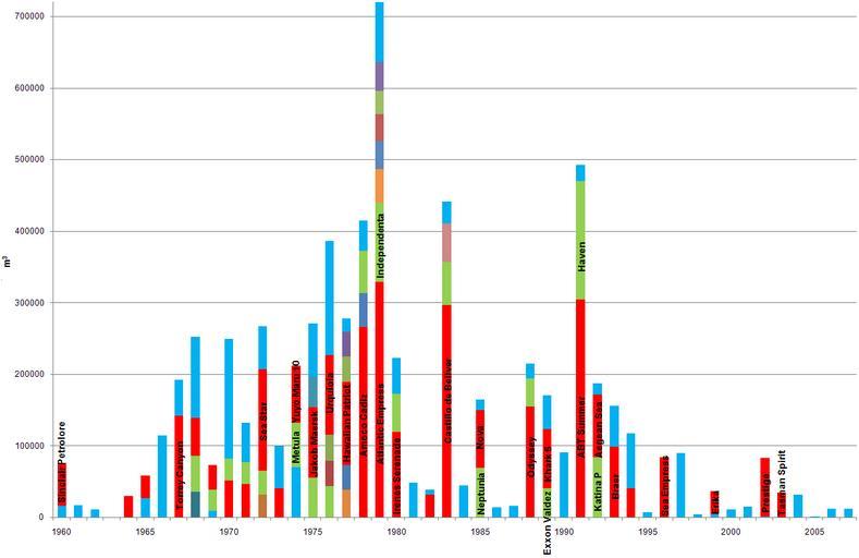 | Keywords: Spill Volume.PNG en Oil spills by tankers; In red the largest spill that year by one tanker In lightblue all spills smaller then 30000 m3 combined Other colours single spills larger then 30000 m3 own based on http //www c4tx org/ctx/job/cdb/prod/search html CTX Casualty Database BoH 2008-09-06 Based on spills of more then 1000 m3 in the http //www c4tx org/ctx/job/cdb/prod/search html CTX Casualty Database Oil tankers | ||||