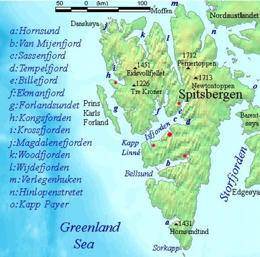 Keywords: Spitsbergen mountains and marine features labelled.png en Map detailing the marine features of Spitsbergen in the Svalbard archipelago Settlements are indicated and labelled See also Image Spitsbergen settlements mountains and marine features labelled png Locations were labelled based on detailed maps from http //www svalbard-images com/spitzberg/spitzberg-sud php svalbard-images com sample of south Spitsbergen linked cross-referenced with other map sources http //miljo npolar no/placenames/pages/detaile asp placeNameID 615073M Norwegian Polar Institute figures were used for mountain names and heights which are given in meters above sea level 2006-07-24 own assumed TheGrappler http //www demis nl/home/pages/wms/demiswms htm DEMIS World Map Server generated this map from Public Domain sources DEMIS does not claim any rights over the resultant image http //www2 demis nl/mapserver/DataSrc htm Alterations including the addition of settlements and captions were performed on 24 July 2006 by User TheGrappler the uploader who releases all associated rights PD-Demis Maps of Svalbard Spitsbergen |