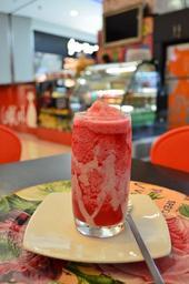 Keywords: spoon dish red dessert cold ice glass restaurant food sorbet granita strawberry sweet cream table dining room drink