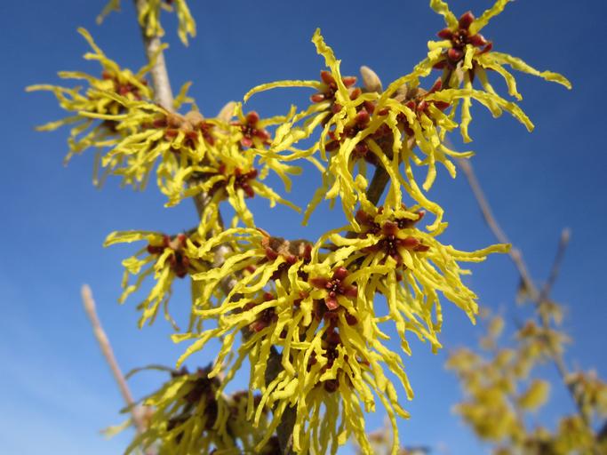 Keywords: spring blossom bloom yellow branch flowering twig sky early flowering bush harbinger of spring