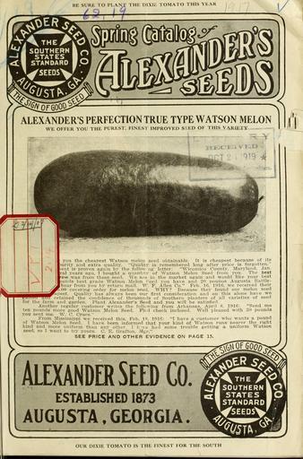 | Keywords: Spring catalog of Alexander's seeds (16249771910).jpg BE SURE TO PLANT THE DIXIE TOMATO THIS YEAR <br> 1/ <br> – SMI <br> ass <br> ” Hi <br> J fl <br> Sj <br> UyJI <br> IBB <br> ALEXANDER'S PERFECTION TRUE TYPE WATSON MELON <br> WE OFFER YOU THE PUREST FINEST IMPROVED SEED OF THIS VARIETY <br> i <br> n <br> <br> you the cheapest Watson melon seed obtainable It is cheapest because of its <br> rarity and extra quality Quality is remembered long after price is forgotten <br> lent is proven again by the following letter Wicomico County Maryland Jan <br> ral years ago I bought a quantity of Watson Melon Seed from you The best <br> rew was from these seed We are in the market again and would like your best <br> rands best grade Watson Melon Reed vou have and 20 pounus Augusta Rattle- <br> hear from you by return mail W F Allen Co Feb 10 1910 we received their <br> 00 covering order for melon seed WHY Because they found our melon seed <br> Fapest Quality has always been our first consideration and on this alone have we <br> retained the confidence of thousands of Southern planters of all varieties of seed <br> for the farm and garden Plant Alexander's Seed and you will be satisfied <br> Another regular customer writes the following from Arkansas April S 1910 Send me <br> ten pounds more good Watson Melon Seed Find check inclosed Well pleased with 30 pounds <br> you sent me W C Cruce <br> From Mississippi we received this Feb IS 1910 I have a customer who wants a pound <br> of Watson Melon Seed I have been informed that your kind of Watson runs nearer the right <br> kind and more uniform than anv other 1 hive had some trouble getting a uniform Watson <br> seed so I want to try yours C E Grafton Mgr <br> SEE PRICE AND OTHER EVIDENCE ON PAGE 15 <br> ESTAB <br> AUGUSTA <br> OUR DIXIE TOMATO IS THE FINEST FOR THE SOUTH 43935762 150287 78741 Title Page http //www biodiversitylibrary org/page/43935762 1917 10 5962/bhl title 78741 Alexander Seed Co ; Henry G Gilbert Nursery and Seed Trade Catalog Collection Biodiversity Heritage Library Spring catalog of Alexander's seeds Garden Stories Agriculture Catalogs Flowers Fruit Seeds Vegetables U S Department of Agriculture National Agricultural Library bhl page 43935762 dc identifier http //biodiversitylibrary org/page/43935762 Alexander's perfection true type watson melon bhlGardenStories BHLinbloom u s department of agriculture national agricultural library bhlgardenstories bhlinbloom Information field Flickr posted date ISOdate 2015-02-03 CC-BY-2 0 BioDivLibrary https //flickr com/photos/61021753 N02/16249771910 2015-08-24 05 51 25 cc-by-2 0 PD-old-70-1923 Spring catalog of Alexander's seeds Photos uploaded from Flickr by Fæ using a script |