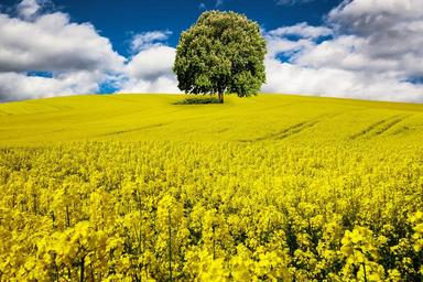 Keywords: spring oilseed rape rape blossom field of rapeseeds blossom bloom field yellow landscape sky tree chestnut tree wide horizon
