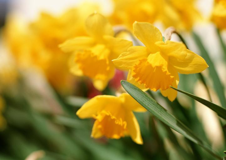 Keywords: daffodil spring narcissus green bed blooming petal flower yellow leaf growing springtime flora stem easter nature flowerbed