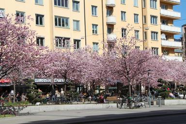 Keywords: spring stockholm tree flowers purple road apartment building street
