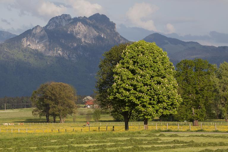 Keywords: spring sunshine may mountains trees nature landscape green meadow dandelion yellow clouds sky