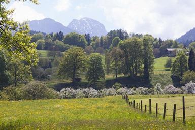 Keywords: spring sunshine may mountains wendelstein trees water nature landscape green pasture fence