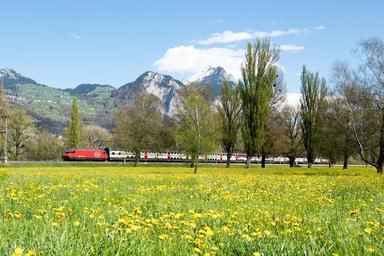 Keywords: spring switzerland landscape glarus trees canton of glarus mountains flowers sky train sbb yellow