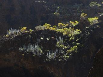 Keywords: spurge spurge family euphorbia atropurpurea back light canarian spurge plant euphorbia canariensis euphorbia euphorbiaceae cactus similar to cacti rock wall overgrown masca ravine tenerife