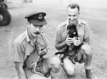 MAKE A MEME View Large Image Coomalie Creek, Northern Territory. Two members of No. 31 (Beaufighter) Squadron RAAF, holding the squadron mascots, a joey (young kangaroo) and a dog. Left to right: Flight Lieutenant G. A. Greenwood and Sergeant B. Agnew. Rights Info: No ...