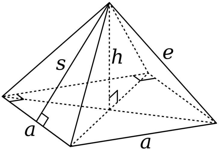 | Keywords: Square Pyramid.svg A diagram showing the basic dimensions of a square pyramid Base side length a Lateral side length e Slant Height s Height h Ostrosłup czworokątny a - długość boku podstawy e - długość boku ściany s - wysokość ściany bocznej h - wysokość ostrosłupa Own 07/05/2008 Inductiveload Pyramids geometry |