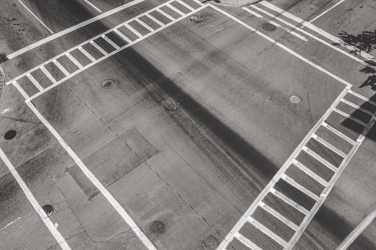 Keywords: square street crossing symmetry city urban architecture gray empty crosswalk intersection road pavement