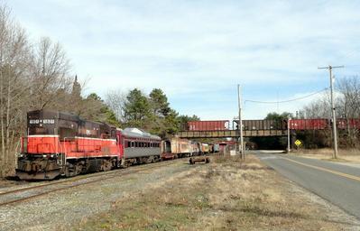| Keywords: SRNJ Winslow Jct 2011a.jpg Southern Railroad of New Jersey in Winslow Township New Jersey Looking northeast towards the end-of-track The Vineland Railway built the rail line in the 1860s southward to Vineland New Jersey Vineland the current terminus of the SRNJ Vineland Railway was later leased by the New Jersey Southern Railroad which itself was succeeded by the Central Railroad of New Jersey and Conrail <br/><br/> SRNJ locomotive no 1801 a model GE U18B U18B built by General Electric is on a siding with rolling stock acquired by SRNJ from various railroads In the middle ground is a trestle with coal hoppers on the Beesley Point Secondary line of Conrail Shared Assets Operations A connecting track to SRNJ is located to the right outside of this photo In the distance is a trestle for the Atlantic City Line of New Jersey Transit Own Caseyjonz 2011-11-27 39 66263 -74 85105 region US-NJ_type landmark_heading NE Winslow Township New Jersey GE U18B locomotives Southern Railroad of New Jersey |