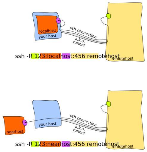 | Keywords: Ssh-R-tunnel.svg en -R specifies that the given port on the remote server host is to be forwarded to the given host and port on the local side via ssh The ssh command is executed on the blue computer own Erik Streb 2014-03-07 Computer network diagrams SSH Cc-zero |