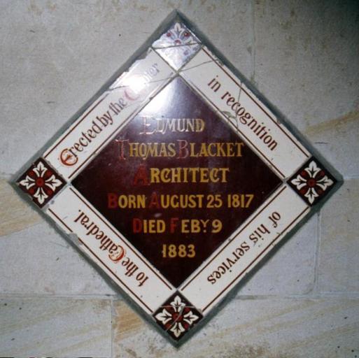 | Keywords: St Andrews Sydney 17 hatchment of Edmund Blacket.jpg Sydney St Andrew's Anglican Cathedral enamelled memorial panel made in shape of a hatchment for Edmund Blacket architect of the cathedral whose ashes are buried nearby own 2000 TTaylor Wall mounted church monuments in Australia Edmund Blacket FoP-Australia St Andrew's Cathedral Sydney |