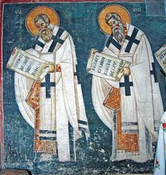 | Keywords: St. Gregory of Agrigentum and St. Antipas of Pergamon, south wall of diakonikon.jpg mk Ф еска на св Г иго иј Аг игентски и св Антипа Пе гамски јужен ѕид на ѓаконикон во ц квата Св Бого одица Пе ивлепта во Ох ид акедонија en Fresco of St Gregory of Agrigentum and St Antipas of Pergamon south wall of diakonikon in Church of the Theotokos Peribleptos in Ohrid Macedonia http //www kalamus com mk/pdf_spisanija/patrimonium_2/006 20Spisanie 202008 20Zarov 2003 pdf По т ети и натписи во олта скиот п осто на Св Бого одица Пе ивлепта во Ох ид author 13 century PD-Macedonia Paintings in the Church of the Theotokos Peribleptos Saint Antipas of Pergamum |