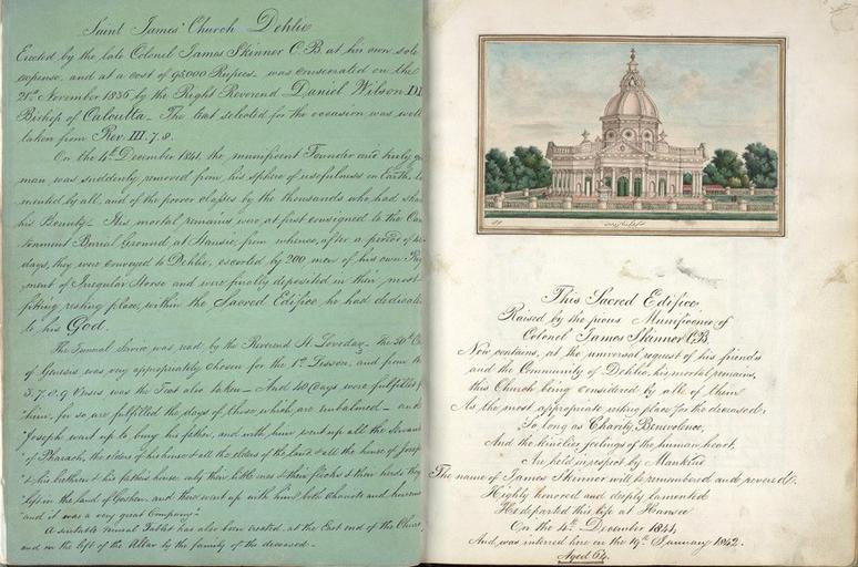 Keywords: St Jame's Church, Delhi, folio from book by Thomas Metcalfe, 1843.jpg St James' Church Delhi folio from Reminiscences of Imperial Delhi an album consisting of 89 folios containing approximately 130 paintings of views of the Mughal and pre-Mughal monuments of Delhi by Thomas Metcalfe 1843 Left Page Saint James Church Delhli Erected by the late Colonel James Skinner C B at his own expense and at a cost of 95 000 Rupees was consecrated on the 21st November 1836 by the Right Reverend Daniel Wilson D D Bishop of Calcutta The text selected for the occasion was well taken from Rev III 7 8 On the 4th December 1841 the munificent Founder and truly good man was suddenly removed from his sphere of usefulness on Earth lamented by all and of the poorer classes by the thousands who had shared his Bounty His Mortal Remains were at first consigned to the Cantonment Burial Ground at Hansi in Hisar district Haryana from whence after a period of 40 days they were conveyed to Delhi escorted by 200 men of his own Regiment of Irregular Horse Skinner's Horse and were finally deposited in their most fitting resting place within the Sacred Edifice he had dedicated to his God The Funeral Service was read by the Reverend H Loveday The 50th Chapter of Genesis was very appropriately chosen for the 1st Lesson and from the 3 7 8 9 verses was the Text also taken And 40 days were fulfilled for him for so are fulfilled the days of those which are embalmed And Joseph went up to bury his father and with him went up all the Servants of Pharaoh the elders of his house all the elders of the land all the house of Joseph his brothers his father s house Only their little ones their flocks their herds they left in the land of Goschen and there went up with him both chariots and horsemen and it was a very good Company A suitable mural Tablet has also been erected at the East end of the Church and on the left of the Altar by the family of the deceased St Jame's Church was commissioned by Colonel James Skinner 1778-1841 a distinguished military officer famous for the cavalry regiment Skinner s Horse While lying wounded on the field of battle he made a vow that if he survived he would build a church in thanks for his life being saved The church designed by Major Robert Smith was started in 1826 and completed ten years later It is the oldest church in Delhi and is built in the shape of a Greek cross with a dome reminiscent of the Renaissance style Inscribed naqsha-i girjaghar nazd-i kashmiri darwaza Drawings by Mazhar Ali Khan Right Page This Sacred Edifice Raised by the pious Munificence of Colonel James Skinner CB Now contains at the universal request of his friends and the Community of Dehlie his mortal remains this Church being considered by all of them As the most appropriate resting place for the deceased So long as Charity Benevolence and the kindlier feelings of the human heart Are held in respect by Mankind The name of James Skinner will be remembered and revered Highly honored and deeply lamented He departed this life at Hansee on the 4th December 1841; And was interred on the 19th January 1842 Aged 64 http //www bl uk/onlinegallery/onlineex/apac/addorimss/s/019addor0005475u00007vrb html Thomas Metcalfe 1795-1853 1843 PD-Art Reminiscences of Imperial Delhi Metcalfe House James Skinner St James' Church Delhi Paintings by Mazhar Ali Khan British Library |
