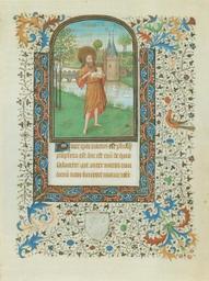 | Keywords: 'St. John the Baptist with the Lamb of Christ', gold leaf and tempera on vellum page from a book of hours.JPG Artwork Creator Anonymous ca 1455 tooled gold tempera vellum cm Institution Honolulu Academy of Arts accession number object history credit line page from a book of hours France Honolulu Academy of Arts Books of Hours 15th-century paintings of John the Baptist Agnus Dei in painting Renaissance paintings in the Honolulu Museum of Art Illuminated manuscripts in the Honolulu Museum of Art John the Baptist with lamb PD-USGov |