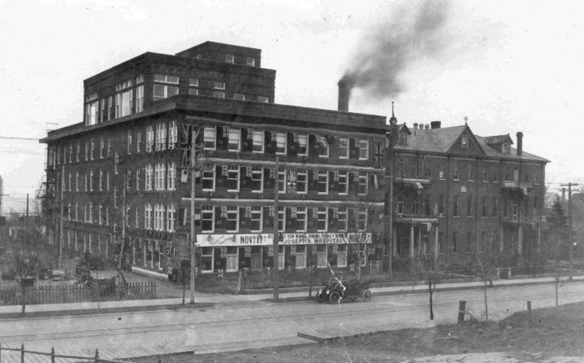 | Keywords: st. joseph's hospital stjosephshospital hospitals health care healthcare medicine st. joseph's stjosephs port arthur portarthur thunder bay thunderbay algoma street algomastreet algoma first world war firstworldwar home front homefront expansion flags ontario canada history blackandwhite monochrome outdoor building architecture building complex black and white Date: 1915 Description: Photograph of the exterior of St. Joseph's Hospital in Port Arthur, ON (view from Algoma Street). A white banner on the first storey announces the opening of the hospital's new wing and their Annual Turkey Dinner on November 17th. Dozens of Ontario flags adorn the front of the new expansion. Accession No.: 975.137.1 Date: 1915 Description: Photograph of the exterior of St. Joseph's Hospital in Port Arthur, ON (view from Algoma Street). A white banner on the first storey announces the opening of the hospital's new wing and their Annual Turkey Dinner on November 17th. Dozens of Ontario flags adorn the front of the new expansion. Accession No.: 975.137.1 |
