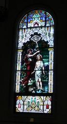| Keywords: St. Leonard church (Madison, Nebraska) baptism window.JPG St Leonard's Catholic Church in w Madison Nebraska The church was designed in Romanesque Revival style by architect Jacob M Nachtigall and built in 1913 With its rectory and a garage it is listed in the National Register of Historic Places The windows were purchased from the Muenich Art Studio in Chicago Illinois This window depicts the Baptism of Jesus Own Ammodramus 2010-02-23 Pictures by Ammodramus Taken with Panasonic Lumix DMC-FZ20 St Leonard's church Madison Nebraska windows Baptism of Jesus Christ on stained glass windows in the United States |
