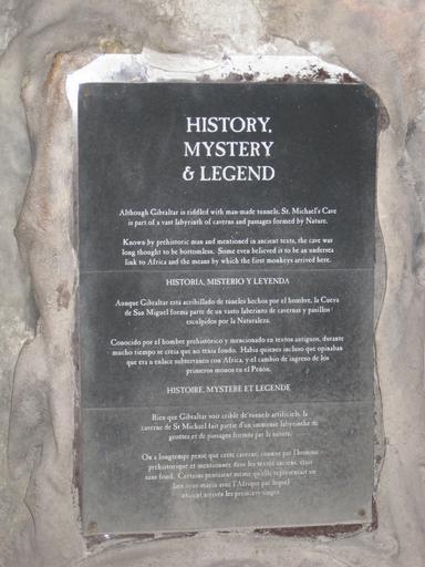 | Keywords: St. Michael's Cave, plaque, Gibraltar.jpg en St Michael's Cave plaque Gibraltar The text reads Although Gibraltar is riddled with man-made tunnels St Michael's Cave is part of a vast labyrinth of caves and passages formed by Nature Known by prehistoric man and mentioned in ancient texts the cave was long thought to be bottomless Some even believed it to be an undersea link to Africa and the means by which the first monkeys arrived here nl St Michael's grot plaquette Gibraltar 2011-12-27 own Bj schoenmakers 36 126755 -5 345477 cc-zero Uploaded with UploadWizard St Michael's Cave Signs in Gibraltar |
