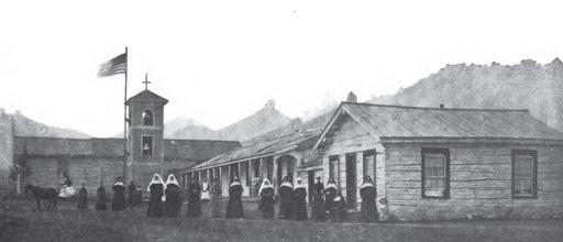| Keywords: St Peters Mission chapel and nuns residence - near Cascade Montana - 1897.jpg en Looking east at the expanded chapel bell tower and single-story wooden nuns resident at St Peter's Mission near Cascade Montana in the United States A group of Ursuline nuns and novitiates pose in front of the buildings This photograph taken in 1897 shows that these buildings -- the earliest built at St Peter's Mission -- were still standing and largely unchanged 16 years after the mission's founding Note that at the end of the resident closest to the viewer the clapboard one-story wooded building turns into a very low log cabin and a next to it closest to the viewer on the far right a more traditionally-sized log cabin These two structures were originally adjacent to the chapel and connected to it and served as residences for the Jesuit priests who founded St Peter's The log cabins were moved and the one-story clapboard structure built in 1882 http //books google com/books id PggXAQAAIAAJ dq 22St 20Peter's 20Mission 22 201896 pg PA337 v onepage q 22St 20Peter's 20Mission 22 201896 f false Flintham Lydia Sterling Leaves From the Annals of the Ursulines Catholic World December 1897 p 335 1897-12 St Peter's Mission Montana PD-USGov |