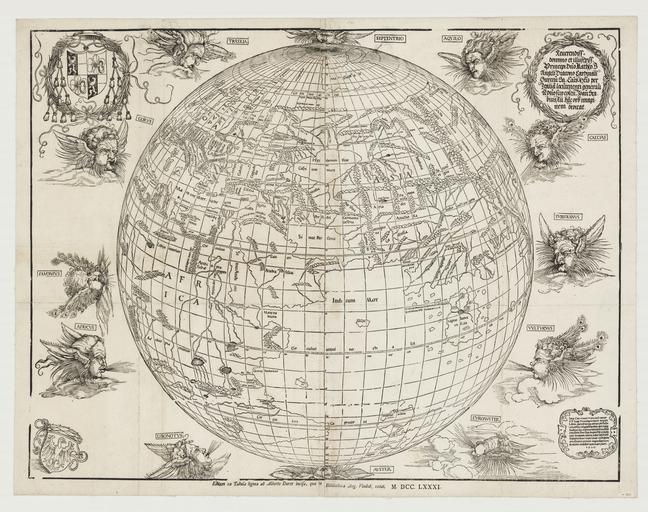 Keywords: Stabius world map II.jpg en A 1781 copy of Johann Stabius's 1515 world map whose engraving is credited to Albrecht Dürer A planisphere globe surrounded by the twelve winds equivalent to Ptolemy's third projection The arms of Matthäus Cardinal Lang von Wellenburg archbishop of Salzburg at upper left; the arms of Johann Stabius imperial astrologer at lower left Dedication to Cardinal Lang at upper right; imperial privilege and date at lower right la Reverendiss domino et illustriss Principi Dño Matheo T Angeli Diacono Cardinali Gurceñ Sa Caẽs Mtis per Italia locũtenenti generali vdño suo colen Joañ Stabius Au hãc orb imaginem dedicat Imp Caes niuus Maximilianus P F Aug Privilegio caiut nequis Libros membraenas cartas pictu'as volumĩa vel quecuqe alia que Ioan Stabius Au sub suo titulo nomie emiserit sine sua expressa voluntate In decem annis a die editioĩs sequentibus imprimat sub pena amissionis rerum impressarum decem mâcharum auri puri 1 5 1 5 Editum ex Tabula lignea ab Alberto Durer incisa quae in Bibliotheca Augustae Vindobonae extat M DCC LXXXI 1781 http //archival-classic sl nsw gov au/album/albumView aspx itemID 913699 acmsid 0 Dixon Map Collection at the State Library of New South Wales Z/Cc 78/2 Johann Stabius after Ptolemy al other versions <gallery> File Stabius world map jpg </gallery> PD-old-70-1923 PD-100 1780s maps of the world 1781 maps Maps in Latin Stabius world map 1781 Dixon Map Library Library of New South Wales Adam von Bartsch |