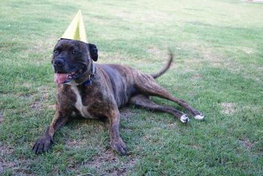 Keywords: staffy dog birthday staffordshire bull terrier brindle relaxed domestic pet obedience happiness cute canine