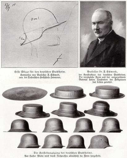 | Keywords: StahlhelmM1916ProfDrSchwerd.jpg en manufacturing process first german steelhelmet Model 1916 first sketch around 1915 and portrait from Prof Dr Friedrich Schwerd de Herstellungsprozess des ersten deutschen Stahlhelms Modell 1916 erster Entwurf um 1915 und Porträt von Professor Dr Friedrich Schwerd Ehrenbuch des deutschen Heeres Major a D F W Deiß Weller Verlag/Berlin 1928 World War I Stahlhelm M16 Historic military equipment of Germany Military history of Germany Deutsches Heer PD-old | ||||