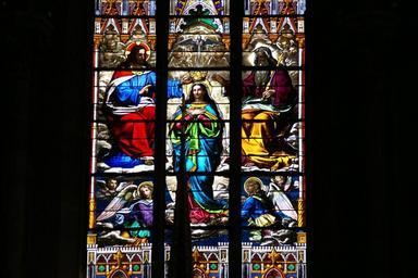Keywords: stained glass window church pattern colorful design texture light decoration artwork ornament effect vivid creativity interior bright painting composition mosaic religion catholic christianity st peter france
