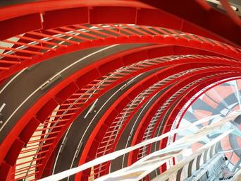Keywords: staircase futuristic architecture locomotion drive rise descent red building interior art