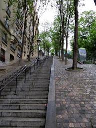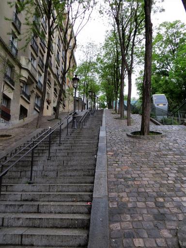 Keywords: stairs stairway staircase cobblestones climb railing upstairs downstairs steps urban city paris france