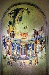 | Keywords: StaMaria Aneu MNAC-015874 0002.jpg La decoració de l ™absis de Santa Maria d ™Ã neu és una mostra de la superposició de temes i motius de l ™Antic i del Nou Testament a la pintura romà nica catalana A la volta hi ha representada l ™Epifania amb Maria en Majestat i els Mags Al registre inferior apareixen els dos serafins de la visió d ™Isaïes al temple de Jerusalem Is 6 3-6 que canten «S AN C TU S S AN C TU S S AN C TU S» i apropen les tenalles amb brases ardents als llavis dels profetes Elies i Isaïes Al mig les quatre rodes de foc del carro de Jahvè al·ludeixen a la visió d ™Ezequiel Ez 1 15 Cal subratllar també el protagonisme dels tres arcà ngels Miquel Gabriel i Rafael advocats el dia del Judici Final Aquesta original temà tica troba la seves fonts en repertoris bizantinitzants d ™Ità lia Final s XII - inici s XI Fresc 700 x 410 x 210 cm exhibition history credit line accession number 015874 own Author ca user amadalvarez Date 2012-07-30 10 43 41 PD-Art Apse of Santa Maria d'à neu |