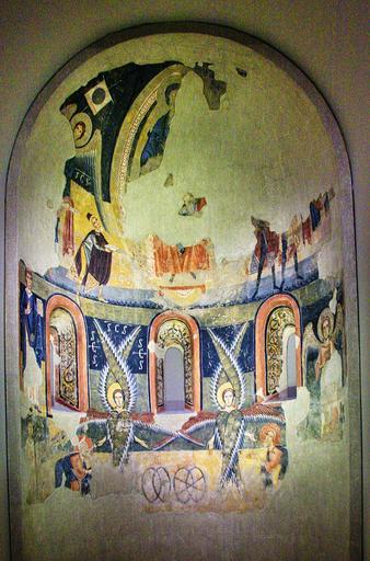 Keywords: StaMaria Aneu MNAC-015874 0002.jpg La decoració de l ™absis de Santa Maria d ™Ã neu és una mostra de la superposició de temes i motius de l ™Antic i del Nou Testament a la pintura romà nica catalana A la volta hi ha representada l ™Epifania amb Maria en Majestat i els Mags Al registre inferior apareixen els dos serafins de la visió d ™Isaïes al temple de Jerusalem Is 6 3-6 que canten «S AN C TU S S AN C TU S S AN C TU S» i apropen les tenalles amb brases ardents als llavis dels profetes Elies i Isaïes Al mig les quatre rodes de foc del carro de Jahvè al·ludeixen a la visió d ™Ezequiel Ez 1 15 Cal subratllar també el protagonisme dels tres arcà ngels Miquel Gabriel i Rafael advocats el dia del Judici Final Aquesta original temà tica troba la seves fonts en repertoris bizantinitzants d ™Ità lia Final s XII - inici s XI Fresc 700 x 410 x 210 cm exhibition history credit line accession number 015874 own Author ca user amadalvarez Date 2012-07-30 10 43 41 PD-Art Apse of Santa Maria d'à neu |